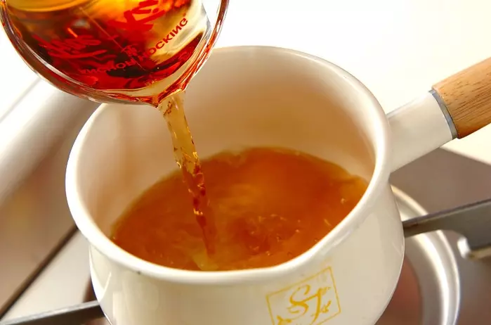 1、鍋に粉寒天、ハチミツ、麦茶を入れて火にかけ、よく混ぜながら煮たった状態で1~2分煮る。