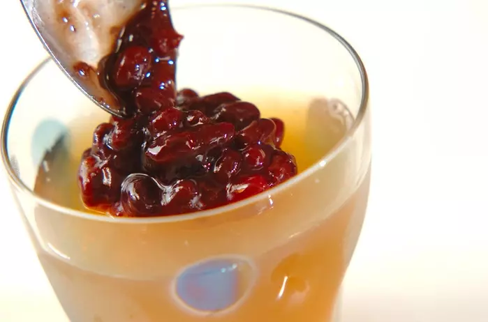 2、(1)の粗熱が取れたら器に流し入れ、冷蔵庫で冷やしかためる。かたまったらゆで小豆をのせる。