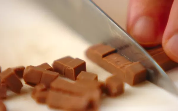 2、<トッピング>の準備をする。チョコレートは飾り用にみじん切りにする。マシュマロは1cm角に切る。