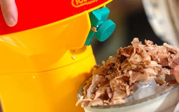 3、(1)のチョコレート氷を器に削りながら入れる。