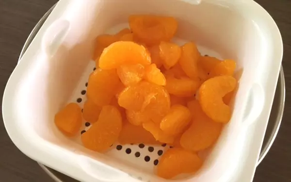 1.みかん缶をざるにあげ、シロップと、みかんとを分ける。