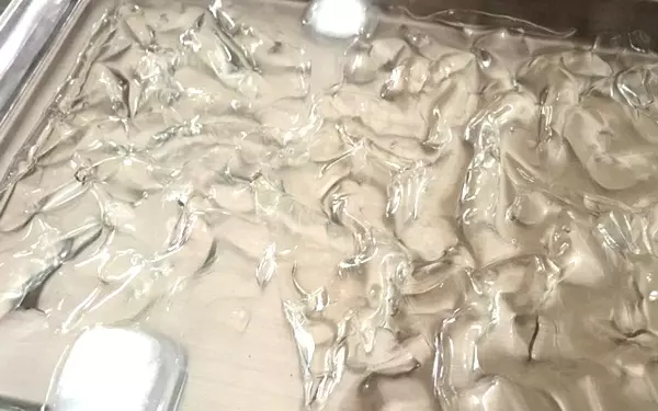 4.浅くて広いお皿(小さめのバットでもよい)に高さ1cmほどの水をはり、その中に板ゼラチンを重ならないように並べ、その上に氷を3つほど入れる(水が冷たい状態を保つため)。