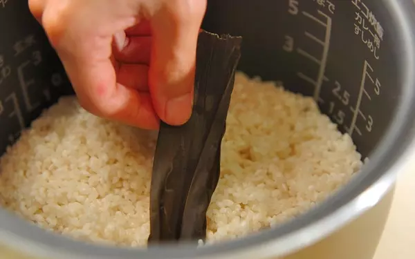・お米は洗い、30分以上浸水してザルに上げ、炊飯器に入れる。汚れを拭き取った昆布を入れて、寿司飯用の分量の水を加えてスイッチを入れる。