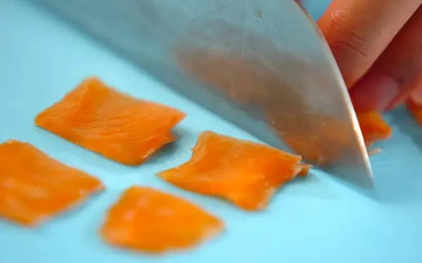 2、レモン皮、ブラックオリーブは粗みじん切りにする。ドライトマトは水で柔らかくもどして粗みじん切りにする。スモークサーモンはひとくち大の正方形に切る。