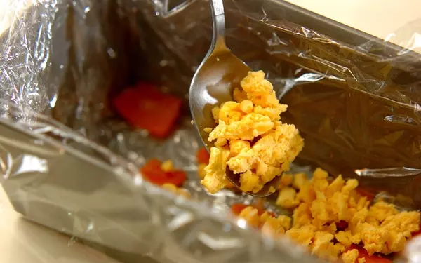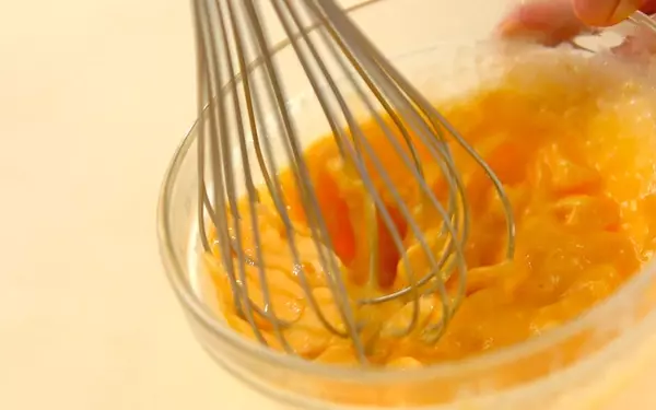 3、耐熱容器に<炒り卵>の材料を入れて、混ぜ合わせる。電子レンジで1分加熱して、ホイッパーで均一にする。30秒ずつ2回に分けて加熱し、その都度ホイッパーで混ぜる。