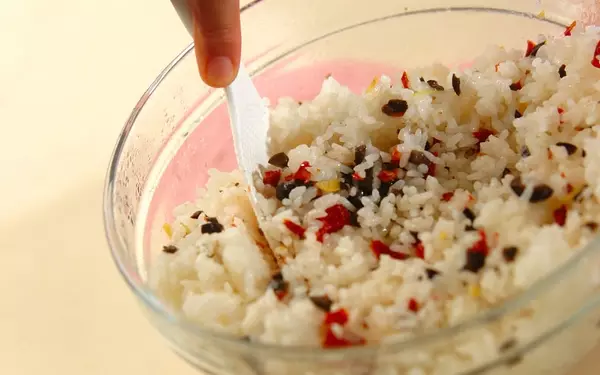 4、ご飯が炊きあがったら10分以上蒸らして、ボウルにあける。(1)をまわしかけ、1分置く。切るように混ぜて、(2)のスモークサーモン以外を加えてさっくり混ぜる。