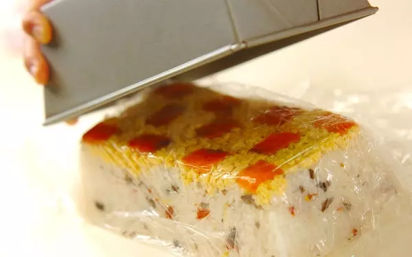 5、お好みの容器にラップを敷き、スモークサーモンを格子模様に敷きつめて(3)をのせる。(4)を広げてラップをし、おさえる。
