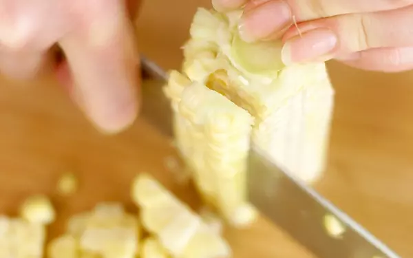 1、生トウモロコシは包丁で実だけを削ぎ落とし、バラバラにほぐしておく。ゴーヤは縦半分に切り、スプーンで中央の種とワタをかき出し、斜め薄切りにする。ナスは薄い半月切りにし、塩水に放ってアクを抜き、しっかり水気を切る。ベーコンは1.5cm幅に切る。