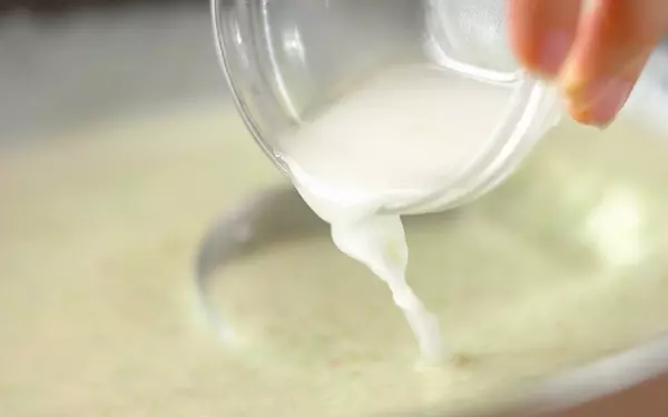 2、固形スープの素が煮溶けたら、枝豆、牛乳、豆腐と共にミキサーでかくはんし、深めのフライパンに入れる。塩コショウで味を調える。