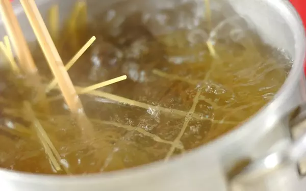 4、たっぷりの熱湯に塩を入れ、スパゲティを加える。袋の時間より1分短めにゆでてザルに上げ、ゆで汁をきる。