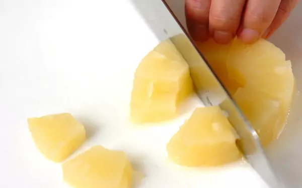 1、パイナップル缶詰め輪切りは8等分に切って容器に入れ、冷凍庫で冷やし固める。