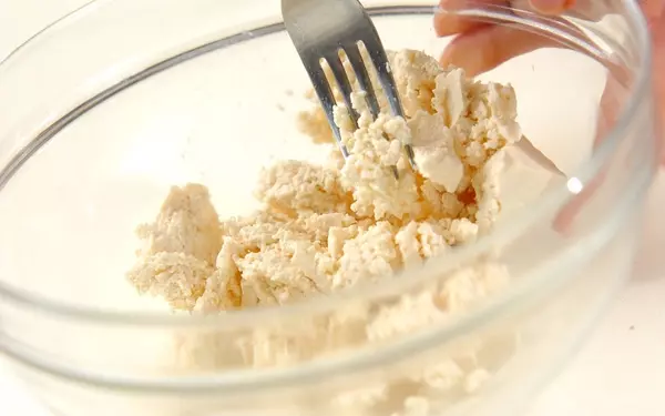 1、ボウルに木綿豆腐を入れ、フォークでつぶす。
