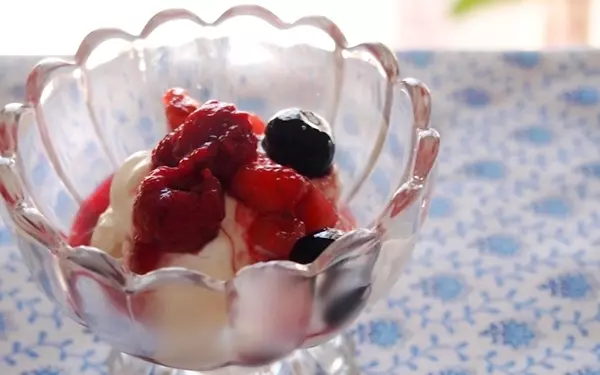 4、(3)をバットに入れ、ラップをして冷凍庫で30分程度冷やす。固まりかけたらほぐし、なめらかにする。器に盛り、(2)の<ベリーソース>をかける。