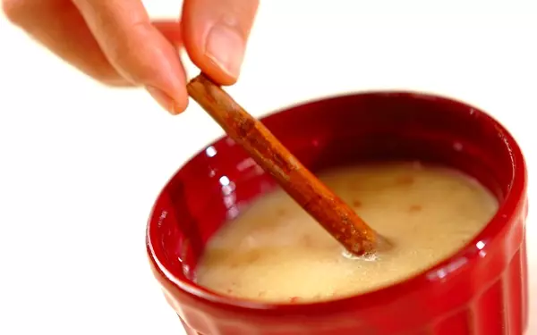 2、カップに(1)、シナモンスティックを入れ、電子レンジで1分加熱する。