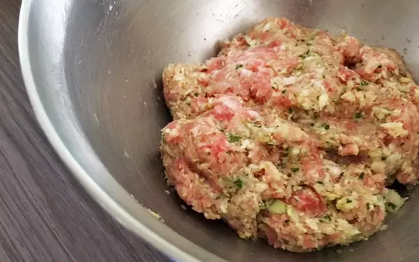 2、1に豚ひき肉を入れ、野菜や薬味をしっかり混ぜ合わせながら、ねばり気が出るまでよくこねる。