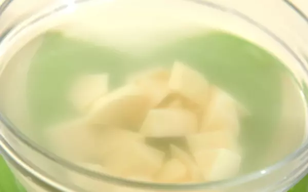 1、サツマイモは皮をむき、小さなひとくち大に切って水に放ち、白濁したらザルに上げる。ソーセージは厚さ1cmの斜め切りにする。