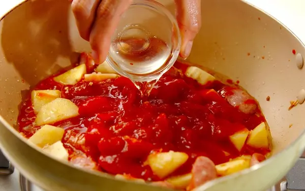 2、フライパンにオリーブ油を熱し、サツマイモ、ソーセージ、ニンニクを炒め、香りがたったら水煮トマト、白ワインを加え、フライパンに蓋をして弱火で蒸し煮にする。