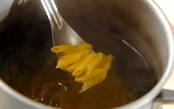 3、鍋に湯を沸かして塩12gを加え、ペンネを表示の時間より2分短くゆでる。