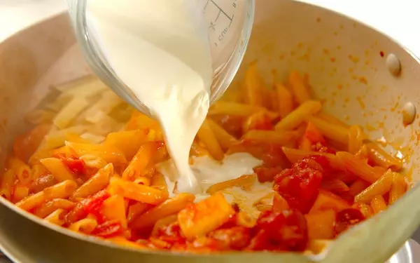ペンネは表示時間より短めに茹で、最後にフライパンでソースと一緒にとろみがつくまで火を加えるのがポイント!