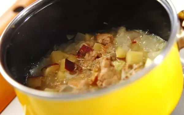 3、鍋にオリーブ油を中火で熱し、玉ネギを炒めてしんなりしたら鮭、サツマイモ、水を加え、弱火でサツマイモが柔らかくなるまで煮る。