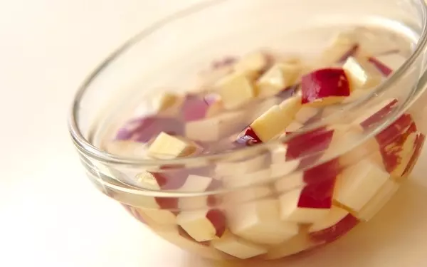 1、サツマイモは皮ごと水洗いして1cm角に切って水に放つ。