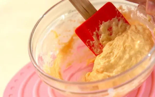 1、<生地>の白玉粉は水で溶いておき、ボウルで他の<生地>の材料とよく混ぜ合わせる。