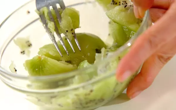 キウイは皮をむき、フォークの背でザックリつぶす。