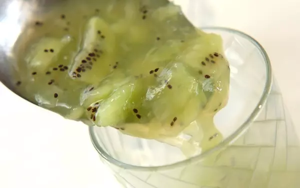 2、キウイを加えて鍋底を水につけ、粗熱が取れたら器に流し入れ、冷蔵庫で冷やしかためる。