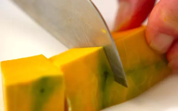 ・カボチャは皮をむいて種とワタを取り除き、4cm角くらいの大きさに切る。冷凍パイシートを冷蔵庫に入れて半冷凍にしておく。