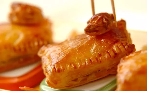 4、(3)にもう1枚のパイシートを上からかぶせ、縁をフォークなどで押さえる(4個作る)。飾り用に残りのパイシートをジャックランタンなどのクッキー型で抜く。