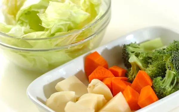 ・ジャガイモ、ニンジンは皮をむき、ひとくち大にきる。サッと水に通し、ぬれたままラップにそれぞれ包み、電子レンジで3~4分加熱する。