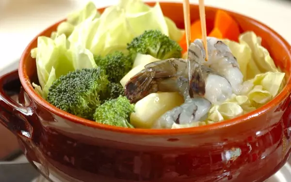 2、少しトロミがついたらエビ、ホタテ、ジャガイモ、ニンジン、ブロッコリー、キャベツを加え、煮えた物からいただく。