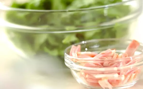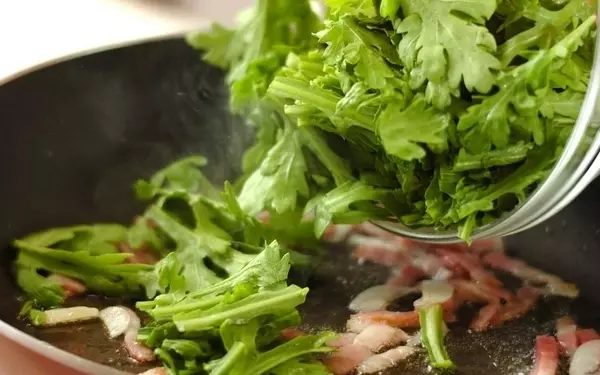 1、フライパンにサラダ油とニンニク、ベーコンを入れて中火にかけ、香りがたってきたら、菊菜を加えてサッと炒め合わせる。