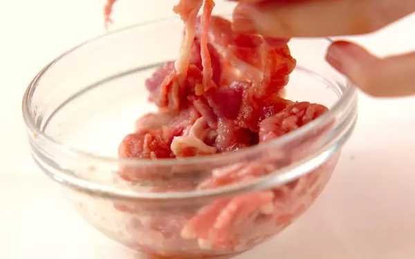 1、豚肉に<下味>の材料をからめる。キャベツはザク切りにする。玉ネギは厚さ5mmのくし切りにする。ニンニクは薄切りにする。<調味料>、<卵液>の材料をそれぞれ合わせておく。