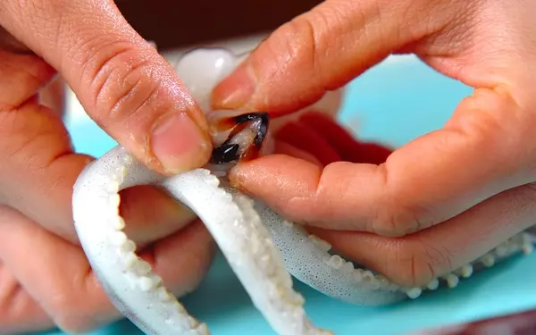 ・イカは足を引き抜き、目とワタを切り落としてくちばしを取り除く。足は先を切り揃えて2本ずつに切り離す。胴は1枚に切り開いてきれいに水洗いし、斜め格子に切り込みを入れ、食べやすい大きさに切る。