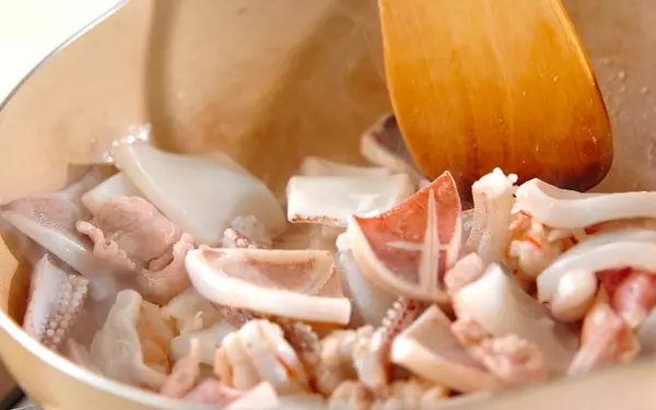 1、フライパンにサラダ油を熱し、エビ、イカ、豚肉を炒める。