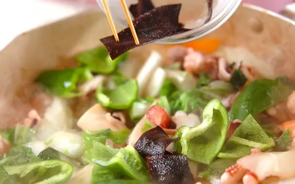 2、ニンジン、白菜、水煮タケノコを炒め合わせ、<合わせ調味料>を加える。煮たったら、ピーマン、キクラゲ、ウズラの卵を加えて煮る。