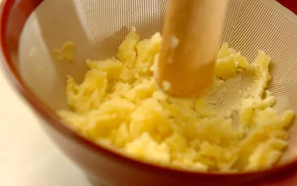 2、竹串が通る様になったらカリフラワーを入れて、ゆでる。ゆであがったらジャガイモをすり鉢に入れ、全体が滑らかになるまですりこ木などでつぶす。