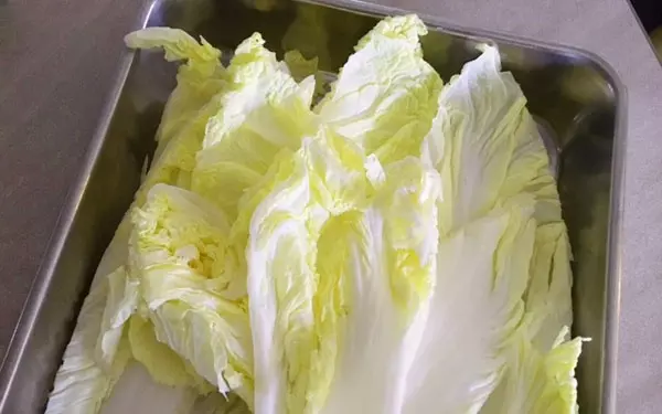 1、白菜は芯の根元部分を切り落とし、葉を1枚ずつしっかりと洗う。