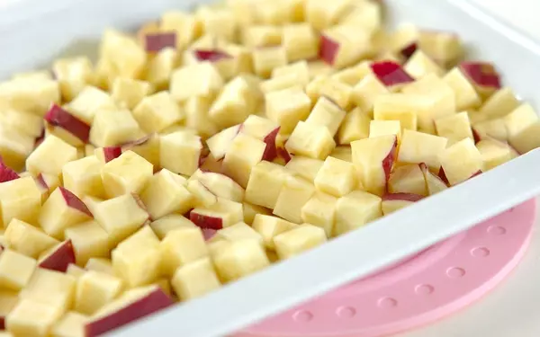 ・サツマイモは皮ごときれいに水洗いし、1cm角に切って水に放つ。水気をきってぬれたまま耐熱皿に入れ、ラップをして電子レンジで2~3分加熱する。電子レンジは600Wを使用しています。