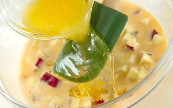 1、ボウルに卵、豆乳、ハチミツを入れ、泡立て器でよく混ぜ合わせる。水気をきったサツマイモ、溶かし無塩バターも加え、混ぜ合わせる。