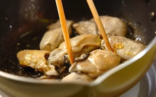 2、焼く直前にカキに塩コショウ、小麦粉をまぶして、余分な粉を落とす。フライパンにオリーブ油とニンニクを入れ、香りが出てきたら、カキを入れ炒める。