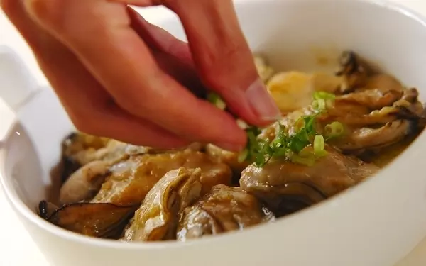 3、火を強めの中火にして、カキにあまり触らないように両面こんがり色づくまで焼く。皿に盛り付け、刻みネギを散らす。