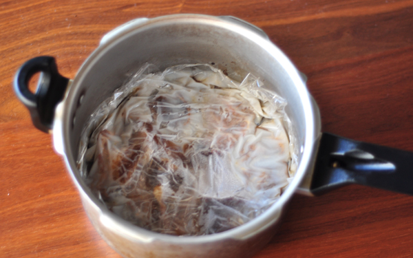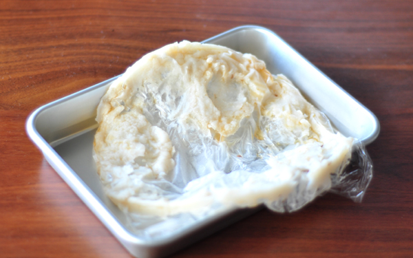2、冷ましてから表面にぴったり密着ラップをして、冷蔵庫へ。
