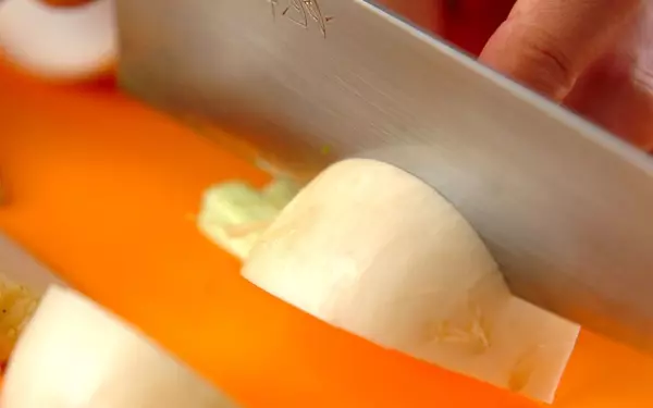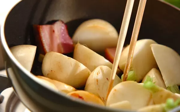 1、カブは根と葉の部分を分け、根の部分は縦に4~8等分に切る。葉はザク切りにする。ニンニクは薄くスライスする。ベーコンは2~3cm幅に切る。