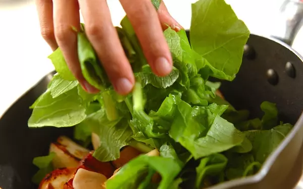 3、カブに火が通ったら、葉も入れ、フライパンをゆすって葉にも油が回るようにする。葉がしんなりしてきたら、塩、黒コショウを振り、火を止める。