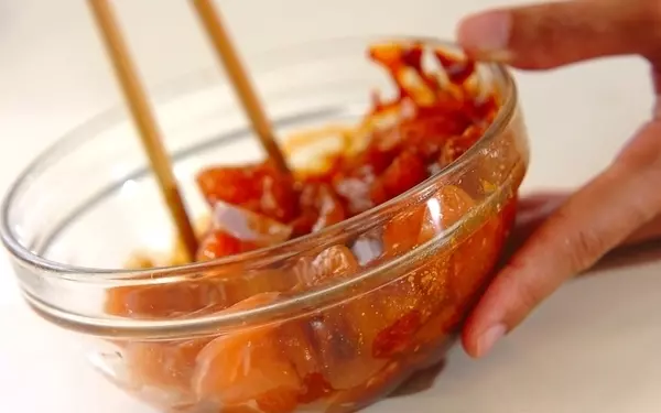 1、サーモンは2cm角に切り、<漬け汁>の材料をからめ10分程おく。