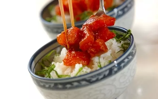 子どもも大人も大好物の漬け丼を韓国風にアレンジ。もちろんサーモン以外にも、マグロやアジなど、お好みの食材で。
