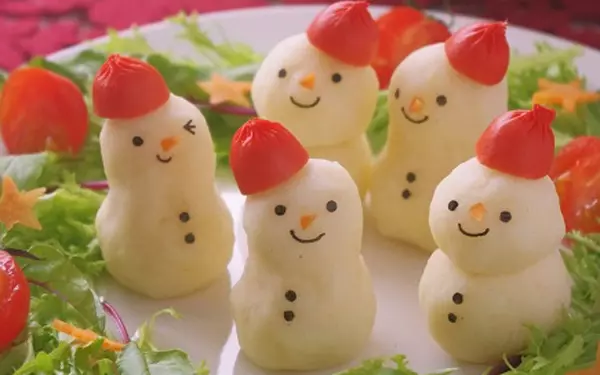 もちろん、いつものおかずもほんのひと手間かけてデコってみるだけで、とってもかわいいクリスマスメニューのひとつになります。子どもが大好きなポテトサラダも、同じように雪だるまにしてみるとこんなかわいい雪だるまのマッシュポテトに大変身!なんだか食べるのがもったいなくて、ついつい飾っておきたくなりませんか?