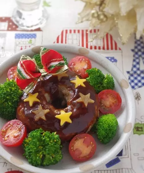 高羽ゆきさんのデコアイディアはほかにもいっぱいです! いつものハンバーグをドーナツ風の形にして焼き、盛り付けの時には星形に切ったにんじんをのせたり、ブロッコリーやトマトを周りに飾ってみると…。ほら、まるでリースのように見えませんか?このデコポイントはリース型のハンバーグと赤と緑のクリスマスカラー! ちょっとしたアイディアでお子さんも大喜びしてくれそうですね!